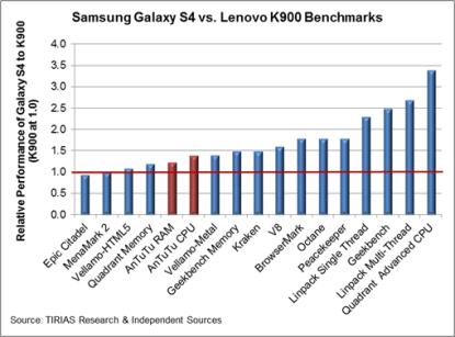 To rectify the situation, AnTuTu issued revision 3.2.2 to the benchmark Wednesday evening. The revision still uses the ICC compiler, but the resulting scores are drastically different for the Intel processor. The AnTuTu CPU and overall scores dropped by approximately 20 percent, while the AnTuTu RAM score plummeted by approximately 50 percent, as shown in the figure below. All other scores for the Intel processor remain relatively the same. Similarly, scores for the Samsung S4 Oct and Qualcomm Snapdragon 600, both used in the Samsung Galaxy S4, remain relatively unchanged.